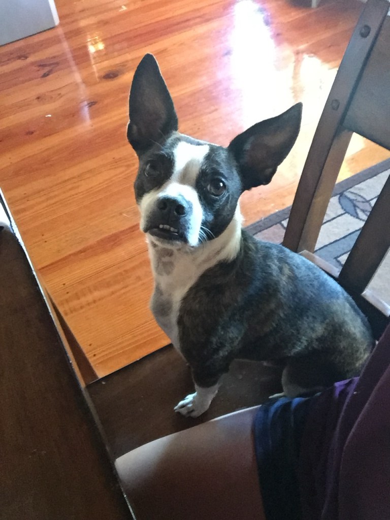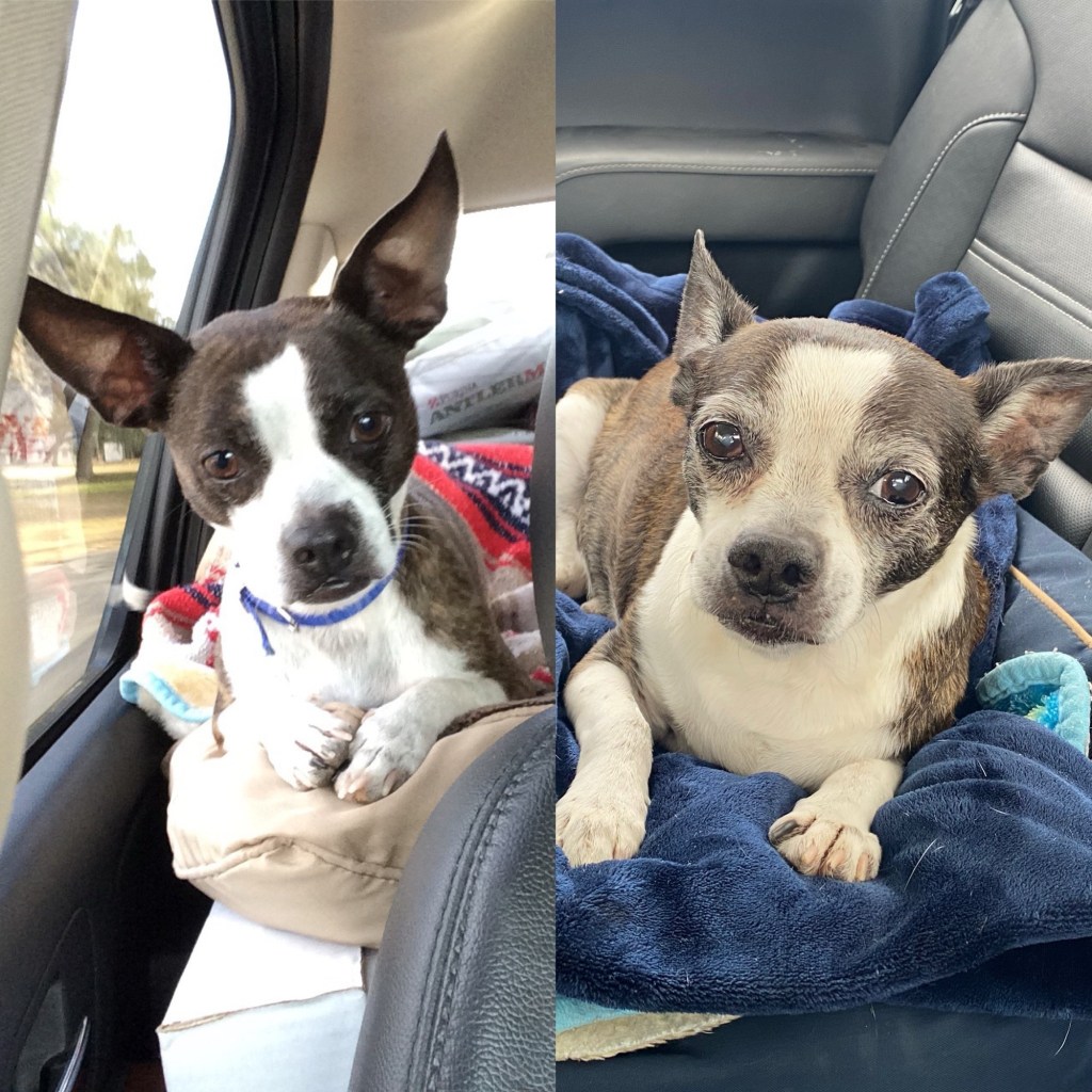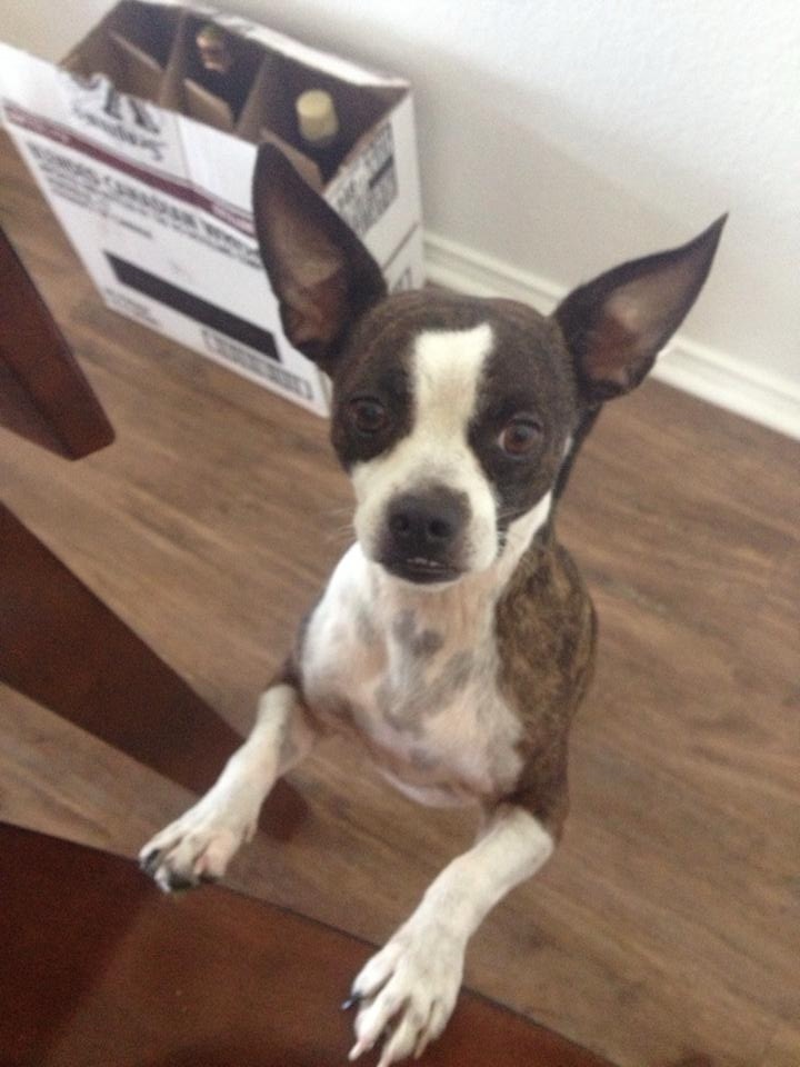 The puppy on Craigslist was named Hershnilla, a portmanteau of Hershey and vanilla. He had a Boston terrier mother and a chihuahua father. A young mom had gotten him for her five year old daughter (who graced him with the name) but the little girl lost interest and the mom didn’t have time to take care of him. In the Craigslist photo, he was four pounds with a little blue tshirt on. His ears were so big and floppy they almost brushed the ground. I can picture the look in his little eyes to this day. I emailed her and paid 200 dollars I didn’t have for him. She met me in a Publix parking lot and handed me the tiniest ten week old puppy wrapped in a plush Care Bears blanket. He was buried in that blanket.