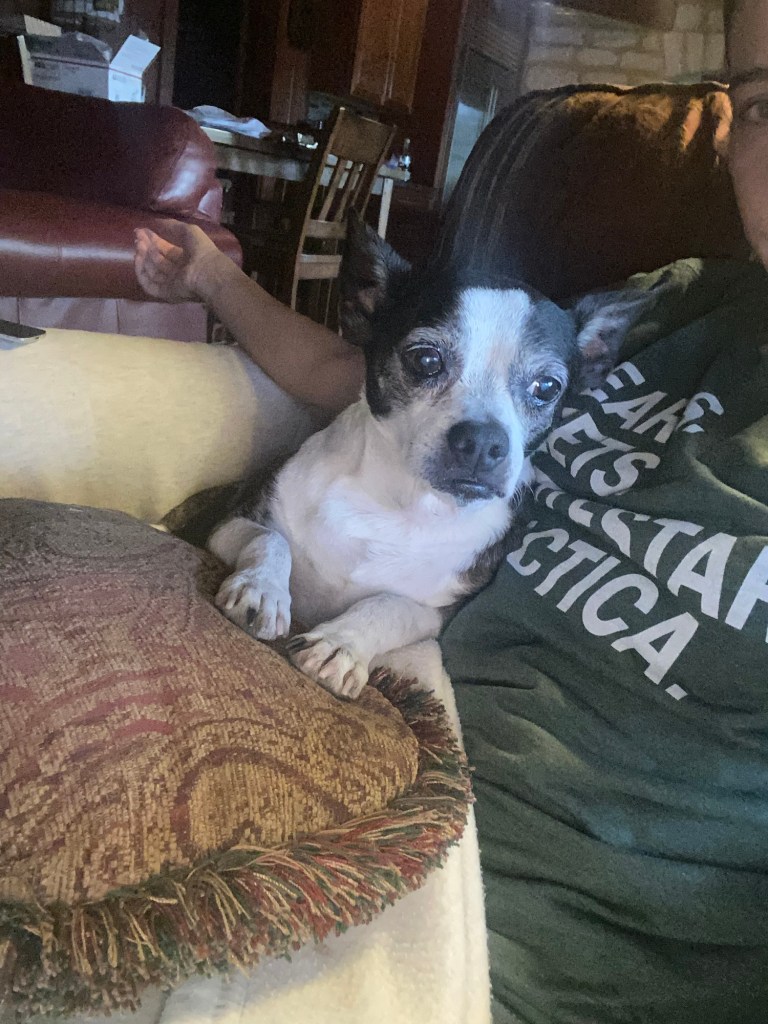 The next couple of years felt like constant blood draws, check ups, and medication adjustments. He would have a few good months and then go downhill again. The seizures never stopped but they were very mild for a long time. By 2022 I decided to stop dragging him to doctors and let him live the rest of his days in peace. He was nearly blind and almost totally deaf. The little dog with the radar ears that could hear thunder from a hundred miles away couldn’t hear me yell his name from across the room. He hadn’t been able to jump in years so we got stairs for the couch and I put him on the bed with me every night. Then on the floor again every morning.